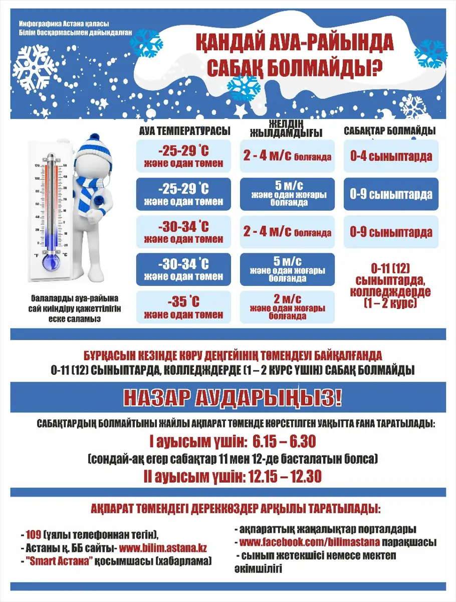 Келесі инфографикада қандай ауа-райында сабақтардың болмайтыны және бұл хабарды қандай көзден ала-алатыныңыз жайлы ақпаратты көре аласыздар.