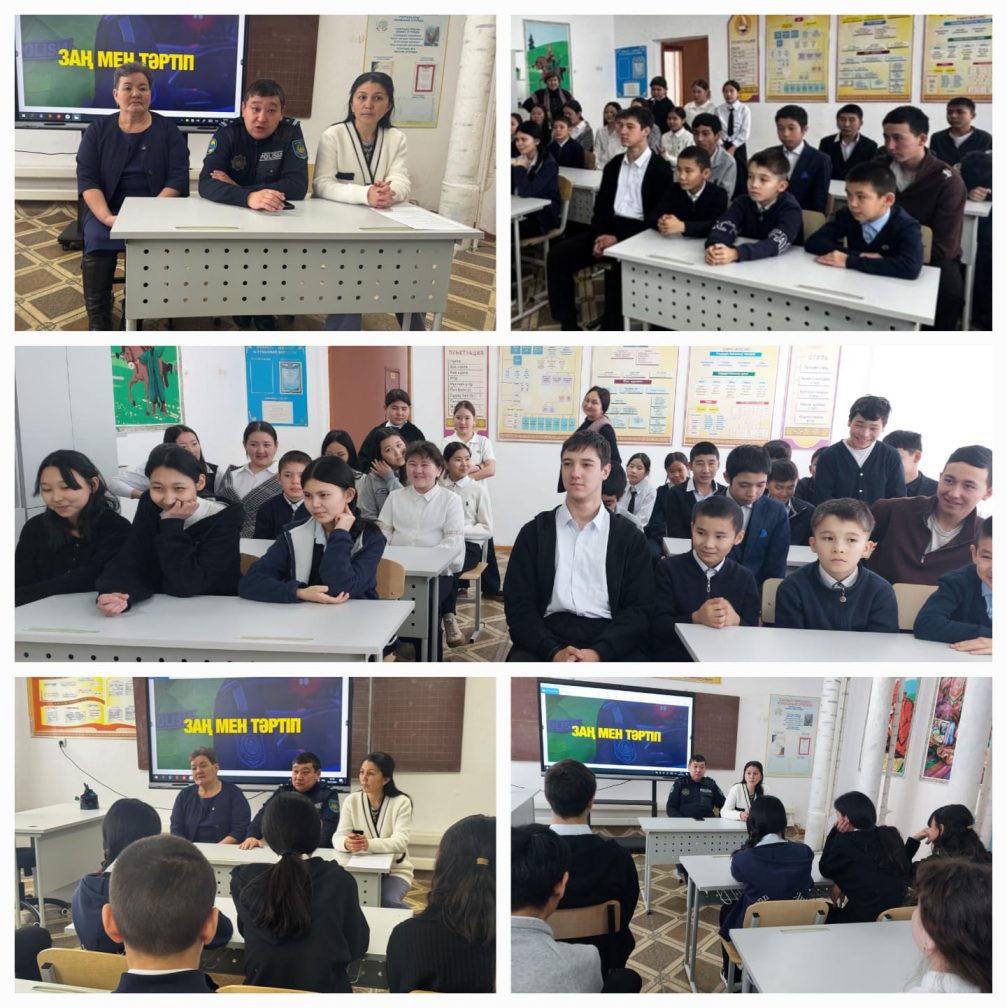 "ЗАҢ ЖӘНЕ ТӘРТІП " тақырыбында участковый полиция инспекторы оқушыларға түсіндірме жұмысын жүргізуді. Кездесудің негізгі мақсаты- оқушыларға заң талаптарын түсіндіру, құқық бұзушылықтың алдын алу, тәртіп сақтау мәдениетін қалыптастыру. Әңгіме барысында участковый кәмелетке толмағандардың құқықтары мен міндеттері және қылмыстық жауапкершілік туралы мәліметтер берді. Сонымен қатар көшеде, қоғамдық орындарда, және интернет кеңістігінде өзін дұрыс ұстау туралы ережелер түсіндірілді. Кездесу тәрбиелік мәні жоғары, пайдалы әрі мазмұнды өтті.